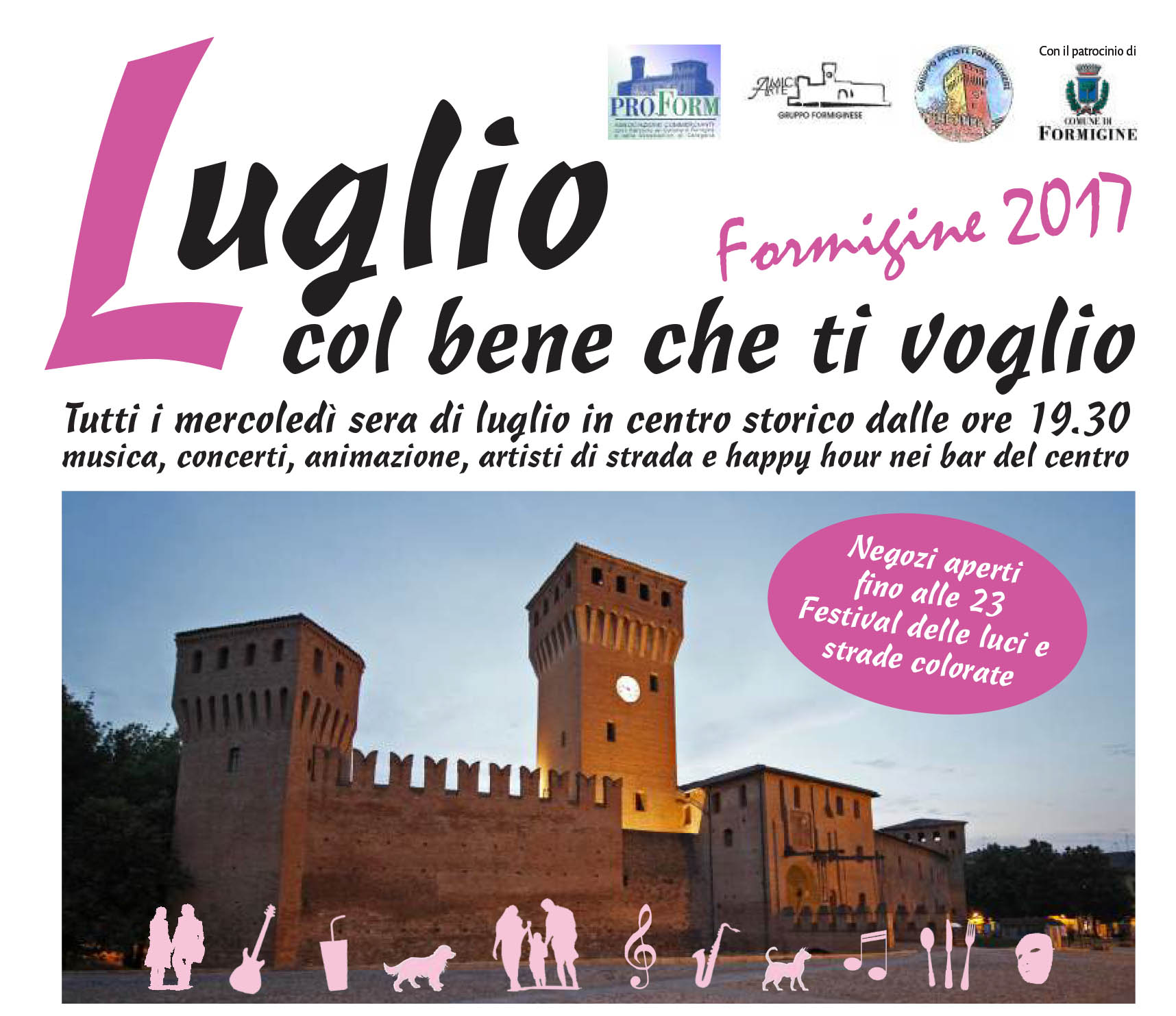 Prende il via domani la sesta edizione dell’ormai tradizionale appuntamento di “Luglio col bene che ti voglio”, manifestazione che per tutti i mercoledì sera del mese vedrà il centro storico animarsi dalle ore 19.30 in poi con musica, concerti, animazione, artisti di strada e happy hour nei bar. In programma, quattro serate a tema. Si comincia domani (5 luglio) con quella dedicata agli anni Sessanta: tra ristoranti, negozi, musiche, giochi, auto, moto, bancarelle, Club delle Vespe, Club delle cinquecento, Club del Maggiolone e dimostrazione di hula hoop per le vie del centro, i formiginesi potranno partecipare a un simpatico viaggio nel tempo che li riporterà a vivere il clima e i colori dei mitici anni Sessanta. Il gruppo The Radio Luxembourg, proporrà "45 giri fa", uno spettacolo musicale a tema con le canzoni che hanno contrassegnato un' epoca. Special guest, il presentatore di TRC Andrea Barbi. Mercoledì 12 luglio invece, serata di pura adrenalina grazie al grande rock proposto dalla band dei Nonentity che sul palco di Piazza Calcagnini riproporrà leggendari brani dei Led Zeppelin, i Queen, Guns 'n' Roses, Acdc, Bon Jovi, Toto, Billy Idol e tanti altri. Il 19 luglio sarà una serata dedicata alla bellezza incarnata dalle ragazze che partecipano alla selezione provinciale del concorso Miss Mondo Italia, appuntamento locale per individuare la candidata italiana a Miss World, il concorso di bellezza più antico e prestigioso al mondo. Ultimo appuntamento con “Luglio col bene che ti voglio”, mercoledì 26, con una serata di energia pura animata dalla band dei Dobro country rock band, storico gruppo - attivo dal 1979 - pioniere del genere country rock in Italia: è una delle poche band italiane nel suo genere che può vantare la presenza di strumenti tipici del country come la pedal steel guitar, il banjo, il dobro ed il mandolino. Tutte le serate prevedono inoltre la presenza di bancarelle dei commercianti davanti alle proprie attività; un gonfiabile gratuito per tutti i bambini, dietro al Castello, presso Fantasy Disney; il Mercatino arte del proprio ingegno e il gruppo artisti formiginesi (Pittori) in via T. Trieste; gli Amici dell'arte in Piazza Repubblica; Parco giochi a cura di Jhonny's Games in Piazza Italia; Gastronomia dolce e salata a cura di Piccolo Ristoro, Bellegati, chiosco Mojito Bar, Vicenzi. I negozi rimarranno aperti fino alle 23 e ogni mercoledì è previsto il festival delle luci e delle strade colorate.