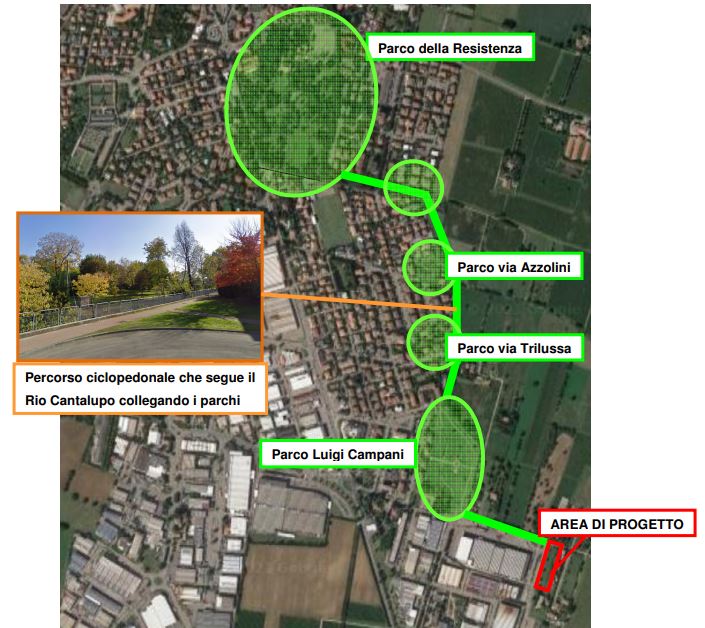 Questo luogo divide un’area industriale di recente costruzione dal territorio rurale, pertanto si presta ad un’azione filtro nei confronti dell’inquinamento atmosferico e acustico e potrà contribuire alla riduzione dell’isola di calore. Inoltre, si trova di fronte ad un sistema forestale boschivo privato esistente e corrisponde ad un varco ecologico (per lo spostamento della fauna selvatica).